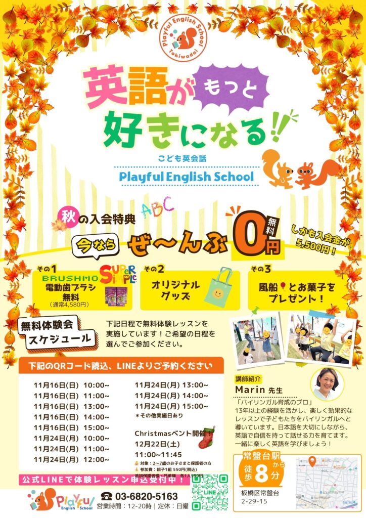 ハロウィンやクリスマスイベント、サマースクールなど有料イベント開催も予定しております!まずは体験レッスンで、当教室の魅力を体感してください!お申し込みは公式LINEからお気軽にどうぞ!