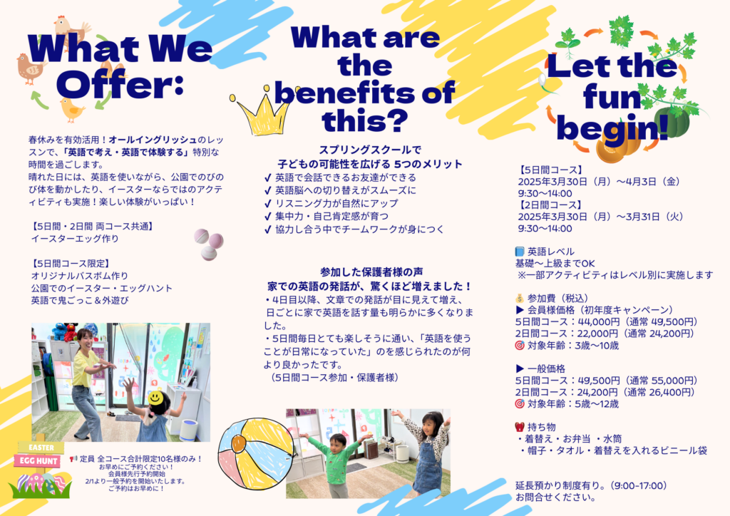 サマースクール(Summer School)スプリングスクール(Spring School) 長期休みを利用した集中プログラムを通じて、普段のレッスンではできないテーマに深く取り組み、英語漬けの時間を過ごします。
